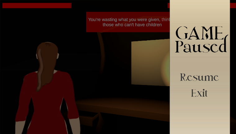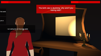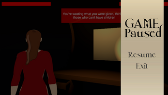 The player plays as a female character imagining themselves in their head. In their head, they are looking at a mirror and they see a monster created out of guilt and stigma because of their choice to be childfree and in their 30s. To fight back against this monstrous personification of their guilt and stigma, they must say the right things to counter the monsters remarks and avoid letting these get to them and lower their mental health.